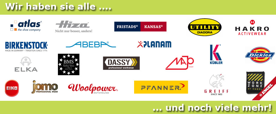 ABEBA | Atlas | Birkenstock | BMS | Dassy | Diadora | Dickie | Eiko | Ejendals | ELKA | ENGEL | FHB | Fristads-Kansas | Greiff | Hakro | Hiza | jomo | Kempel | Kübler |MAJO | Miloty | Oyster | Pfanner | Pionier | Planam | Woolpower | Workzone | und viele mehr!